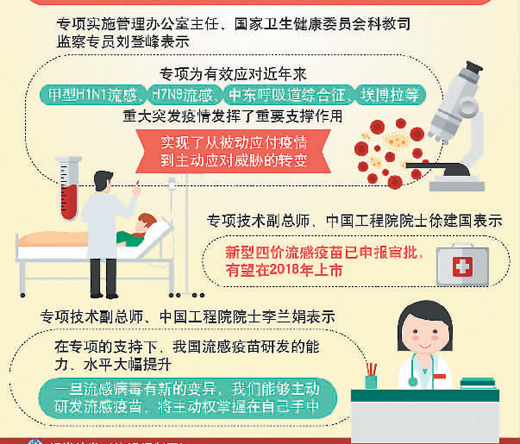 徐建国说,近年来,新药专项还投入近亿元用于流感疫苗佐剂、四价流感疫苗、多价联合疫苗、H7N9相关疫苗及流感疫苗应急研发体系能力建设。目前已有新型流感疫苗成功上市,四价流感疫苗正在进行相关申报审批,有望于今年上市。