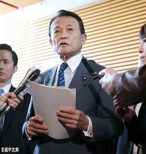 日本副首相兼财务大臣麻生太郎回答森友学园相关问题。(图片来源:《日本经济新闻》网站)