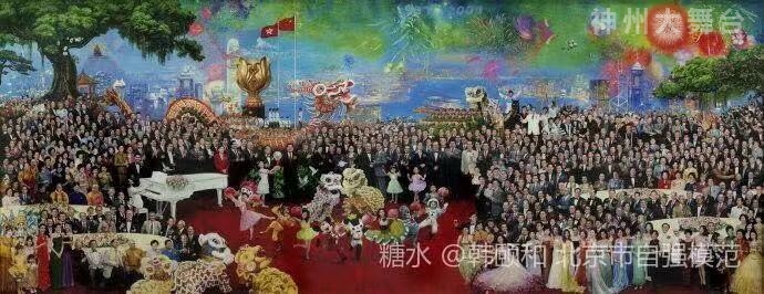 油画作品《良辰》中有包括李嘉诚、成龙等数百位家喻户晓的政界、商界、文化艺术界等几百位各界名流。