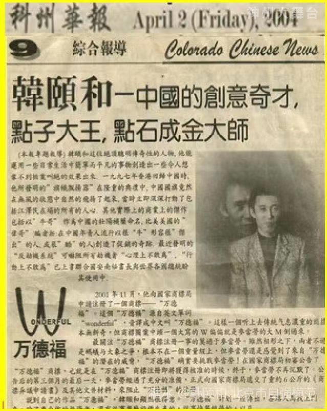 美国科罗拉多州华文报纸及美国50个州的中英文媒体报道:韩颐和—中国的创意奇才,点子大王,点石成金大师。