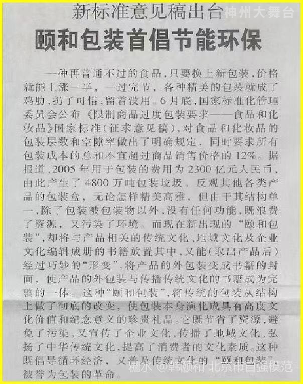 在“第二届中国绿色包装论坛”的主席台上,面对相关部委的领导和全国著名食品企业的老板,韩颐和说的一些不中听的话:所有烟、酒、茶、月饼和高档礼品的豪华包装,毫无“绿色”可言!包括但不仅限于我们以下商品的生产厂家,全都在“认认真真造垃圾,实实在在搞污染!”