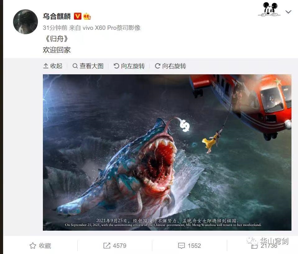 @ 乌合麒麟 在微博上发布了一张新图,并配文“《归舟》欢迎回家 ”中国飞机将孟从美巨鲨嘴中救走。